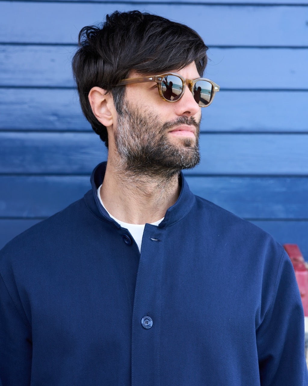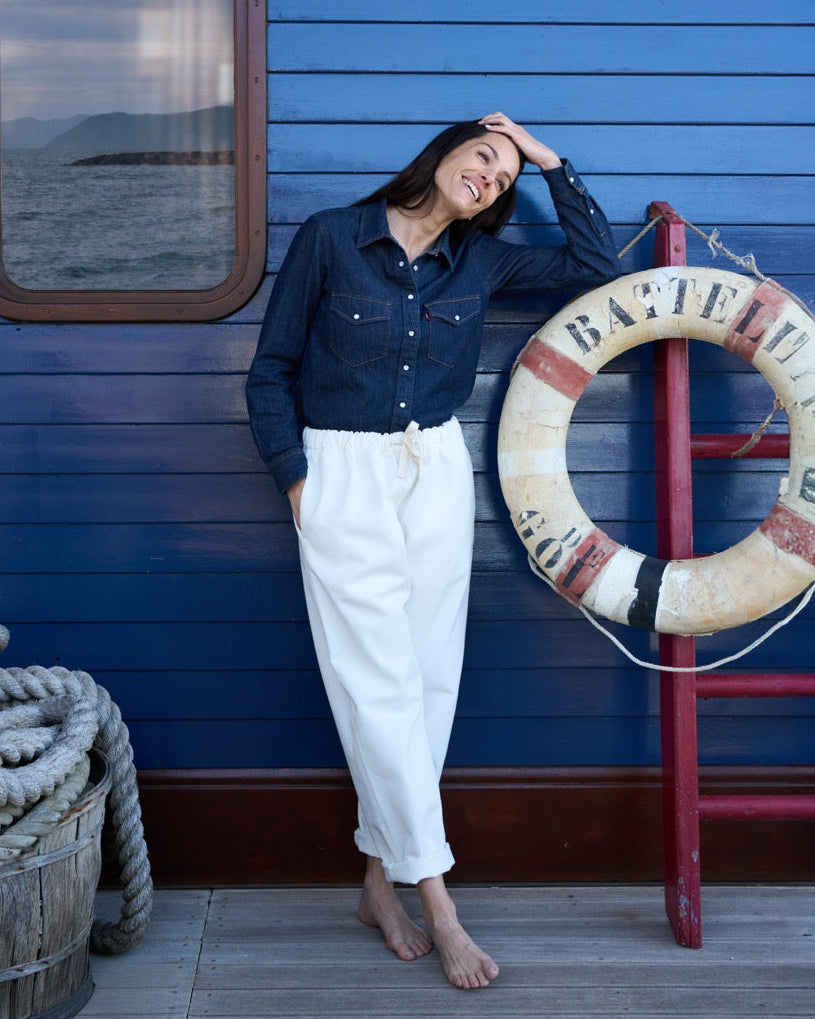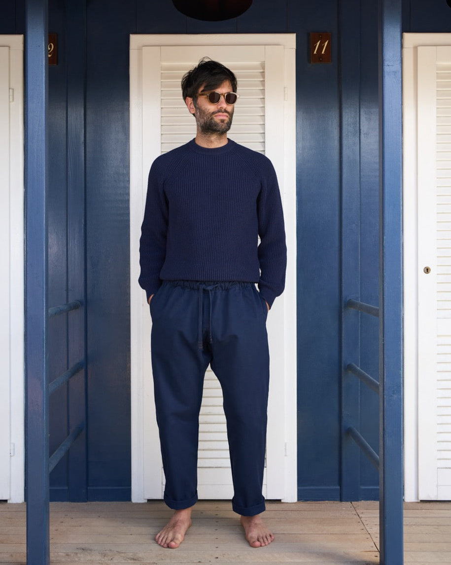 Prodotto in Italia con pregiato cotone Manteco e bottoni in corozo. Rifinito con risvolto e i distintivi passanti Maremosso, di ispirazione nautico/ militare.