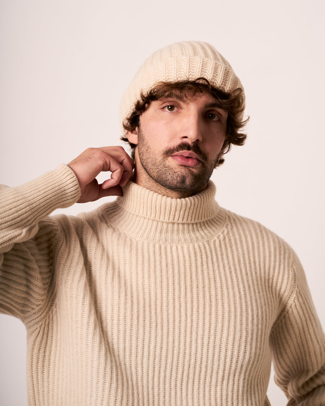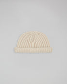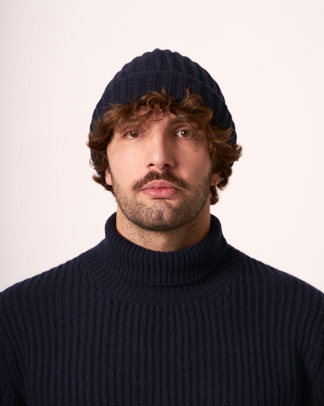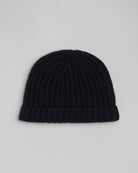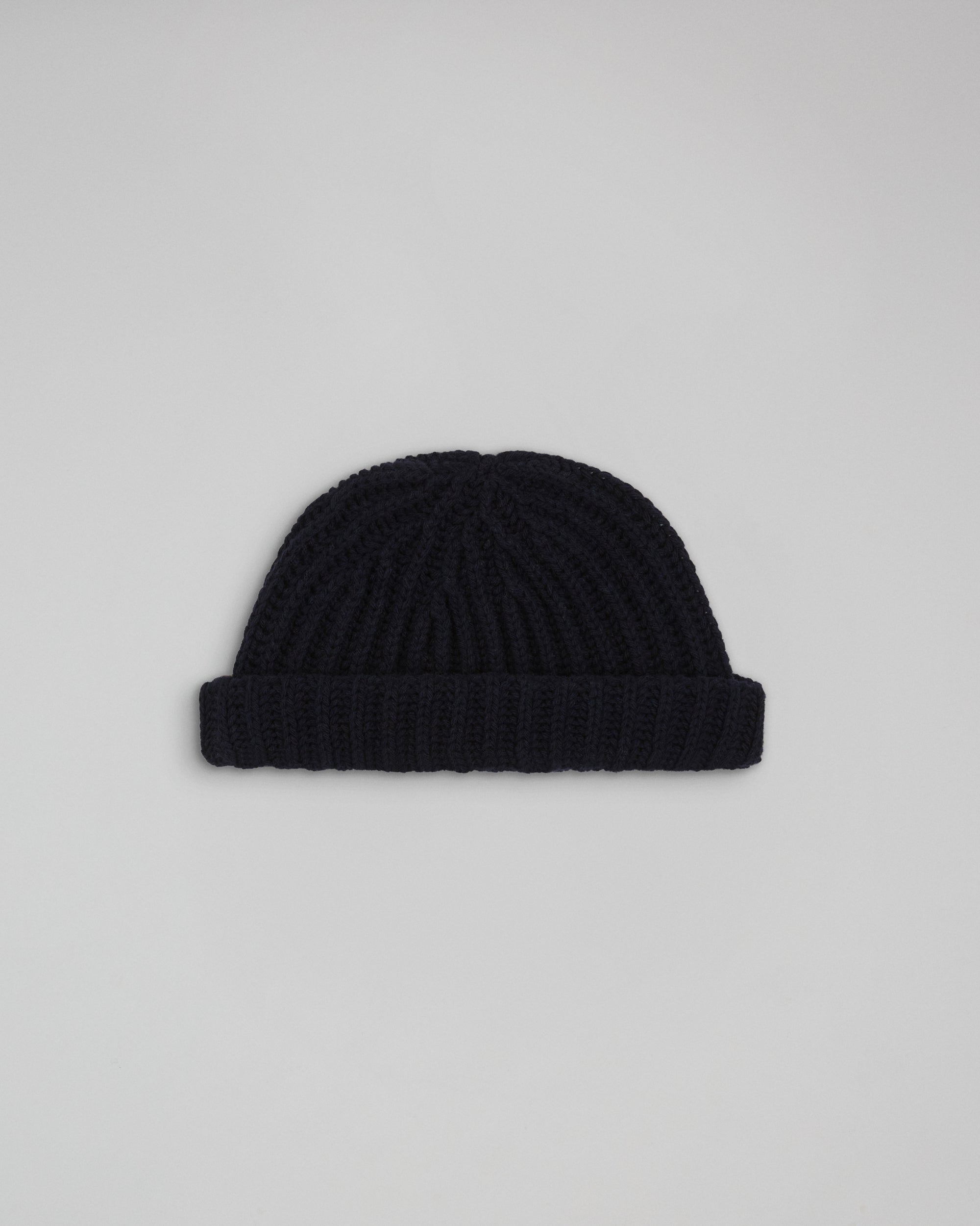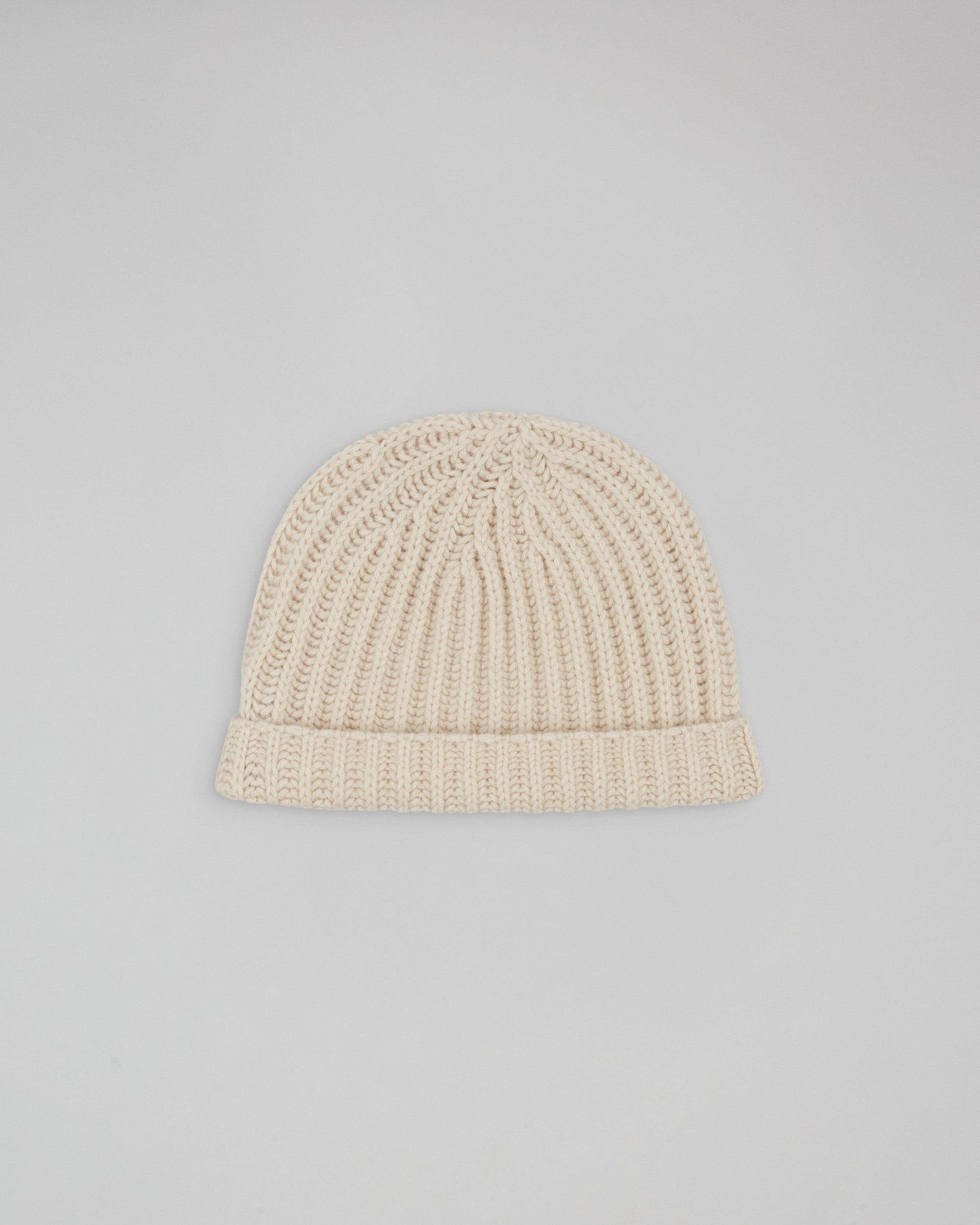 Berretto 90% lana e 10% cashmere, lavorato a coste. Proposto in due taglie, si può indossare con o senza risvolto.