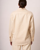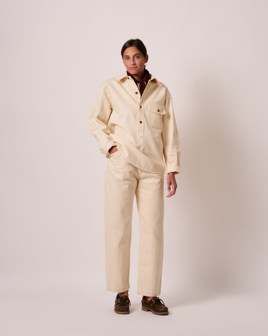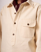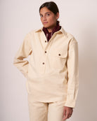Camicia popover in cotone drill, con abbottonatura corta, tasca frontale e polsini con bottone. Rifinita con cuciture tono su tono e i bottoni a contrasto in corozo marrone. Una camicia dal carattere autentico e funzionale, ideale per uno stile essenziale ma distintivo.