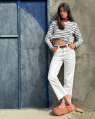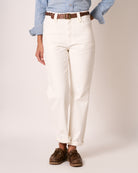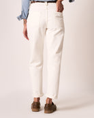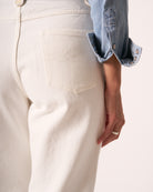 Jeans taglio tradizionale a gamba dritta, realizzati in 100% cotone colore bianco grezzo. Dotati di cinque tasche e rifiniti con cuciture ton sur ton, si distinguono per i caratteristici passanti Maremosso e il ricamo sulle tasche posteriori che richiama le onde. La chiusura è con monobottone e zip.