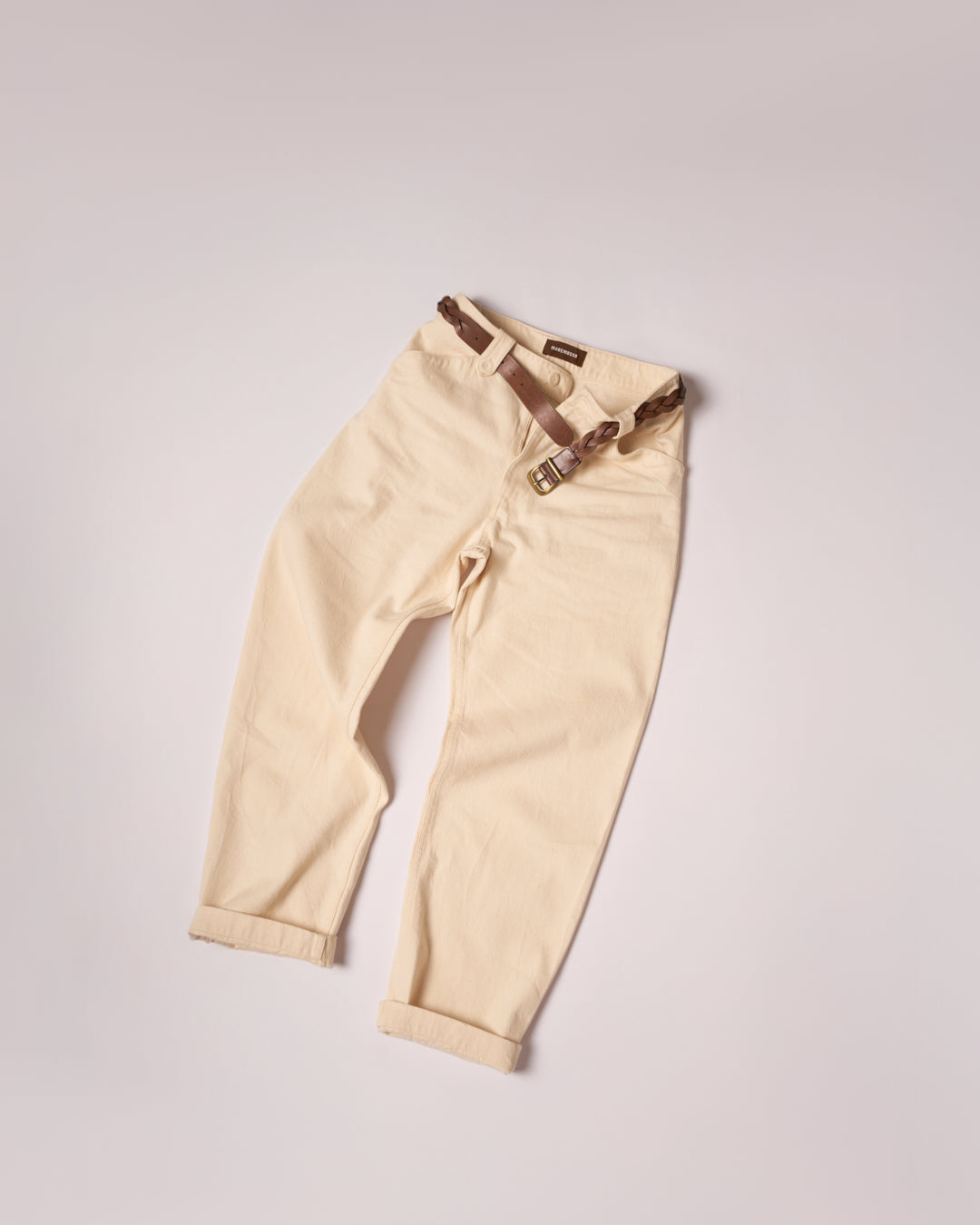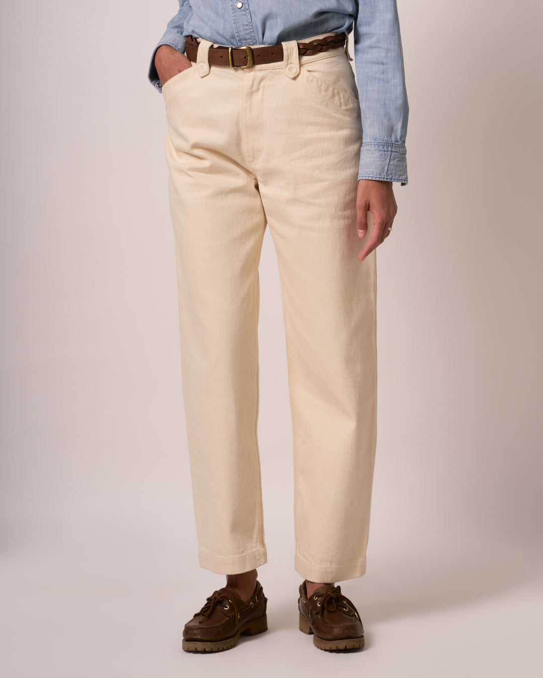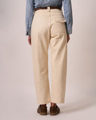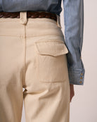 Pantalone di ispirazione Corsa, più ampio nella parte superiore rispetto al fondo, tasche anteriori a taglio orizzontale e unica tasca posteriore. Chiusura con mono bottone e zip. Anche qui troviamo gli iconici passanti Maremosso.