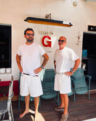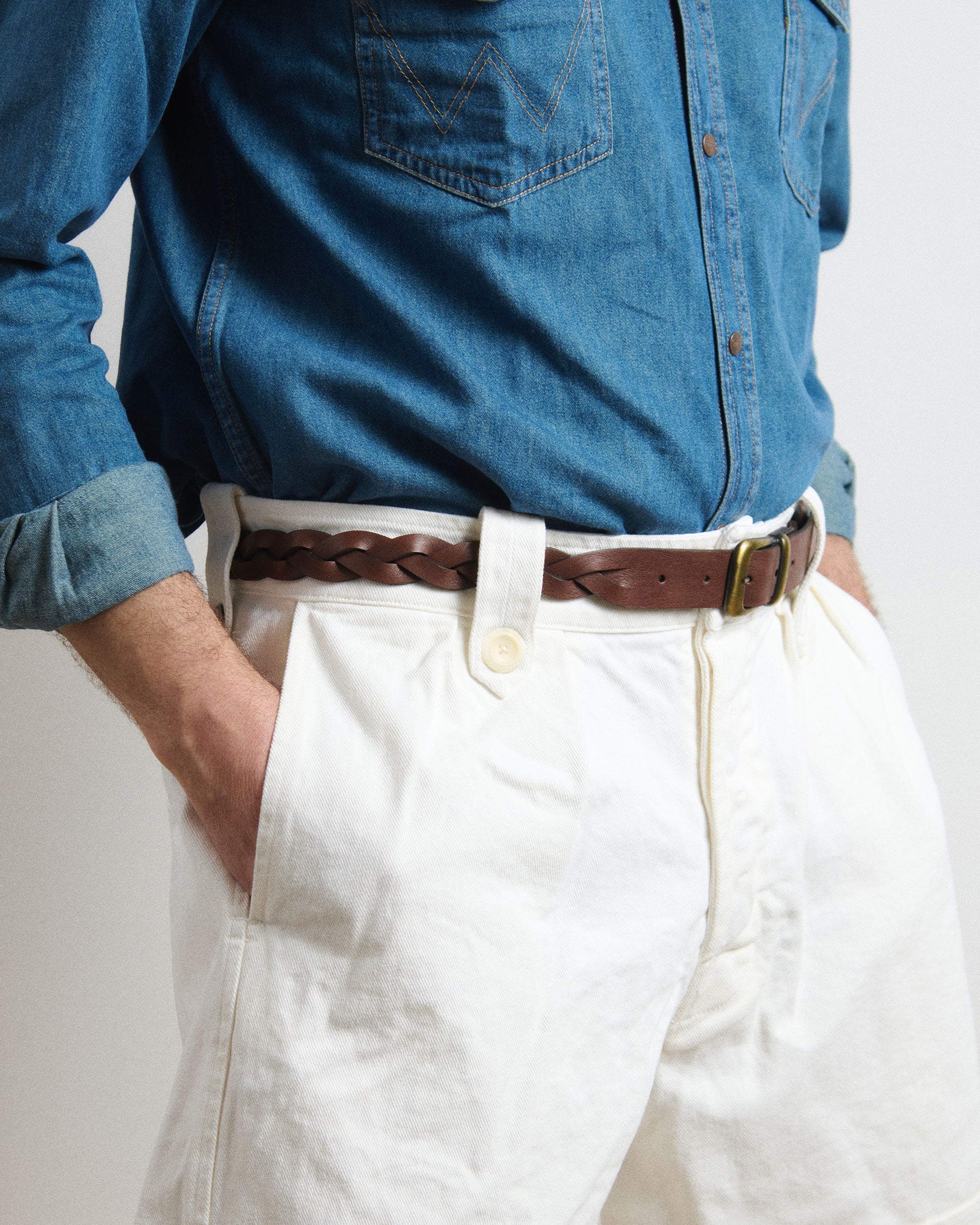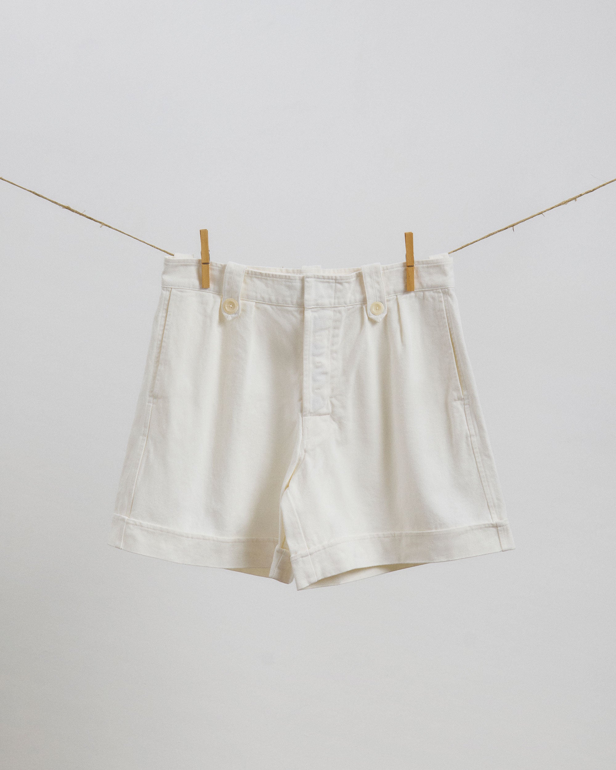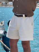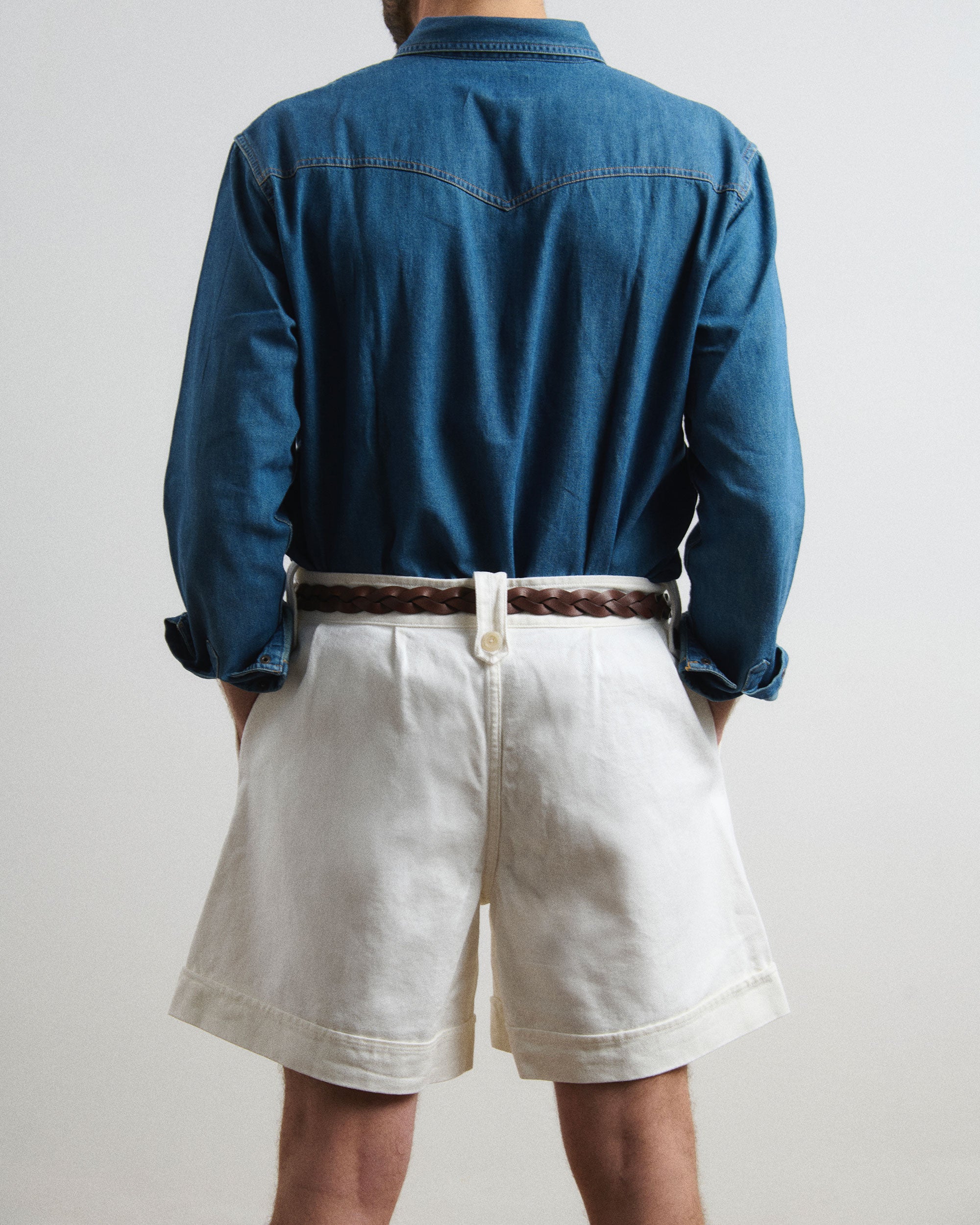 Bermuda a vita alta in 100% cotone, rifinito con cuciture ton sur ton e chiusura con bottone in corozo a scomparsa. Vestibilità normale, due tasche laterali, passanti in vita con bottoni e risvolto, caratteristica distintiva di tutti i bermuda Maremosso.