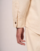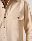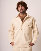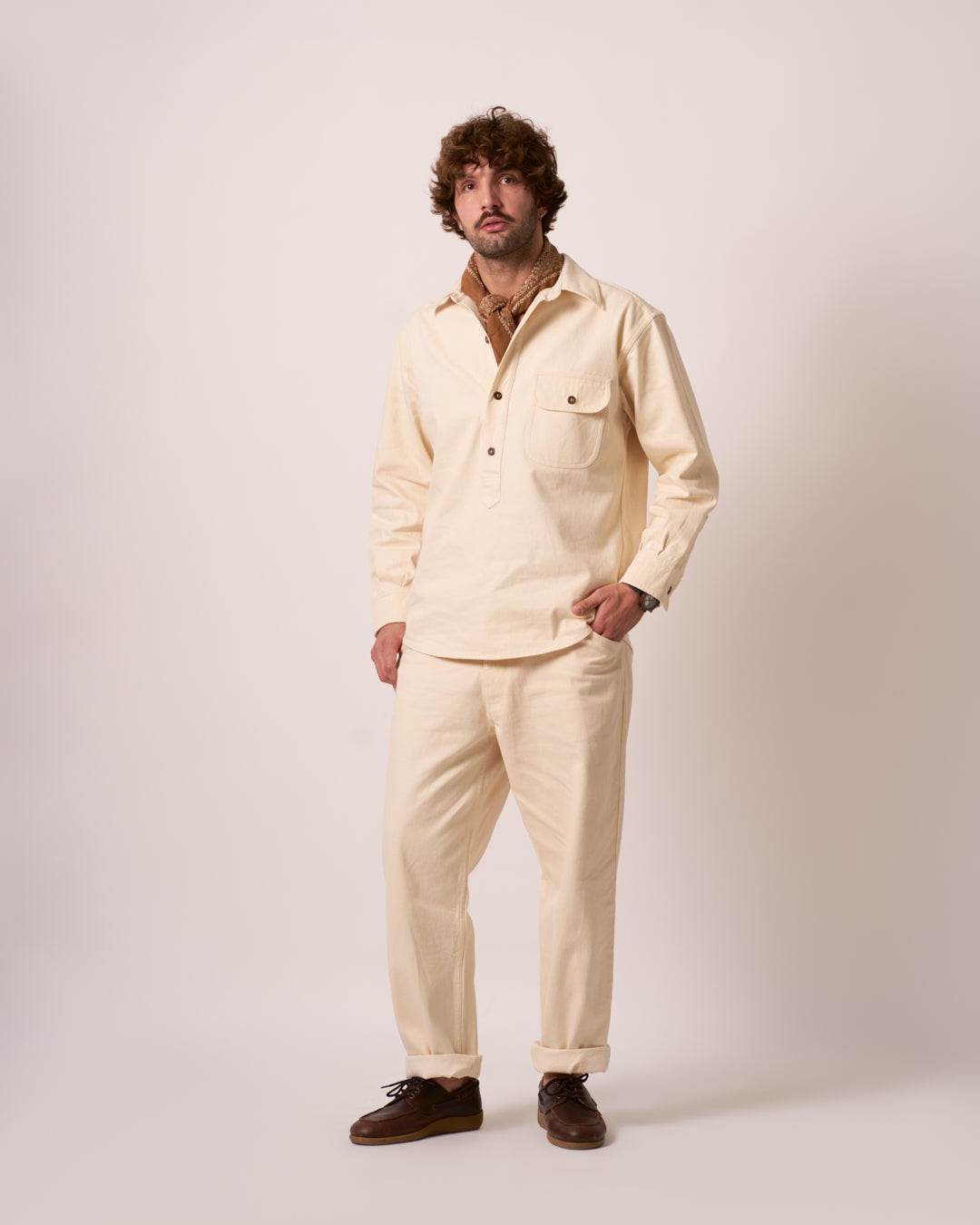 Camicia popover in cotone drill, con abbottonatura corta, tasca frontale e polsini con bottone. Rifinita con cuciture tono su tono e i bottoni a contrasto in corozo marrone. Una camicia dal carattere autentico e funzionale, ideale per uno stile essenziale ma distintivo.