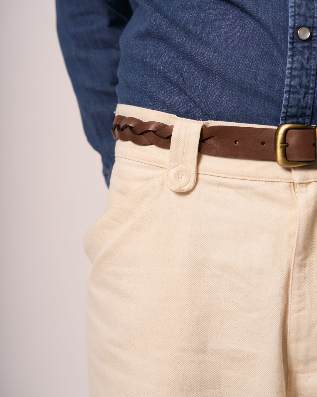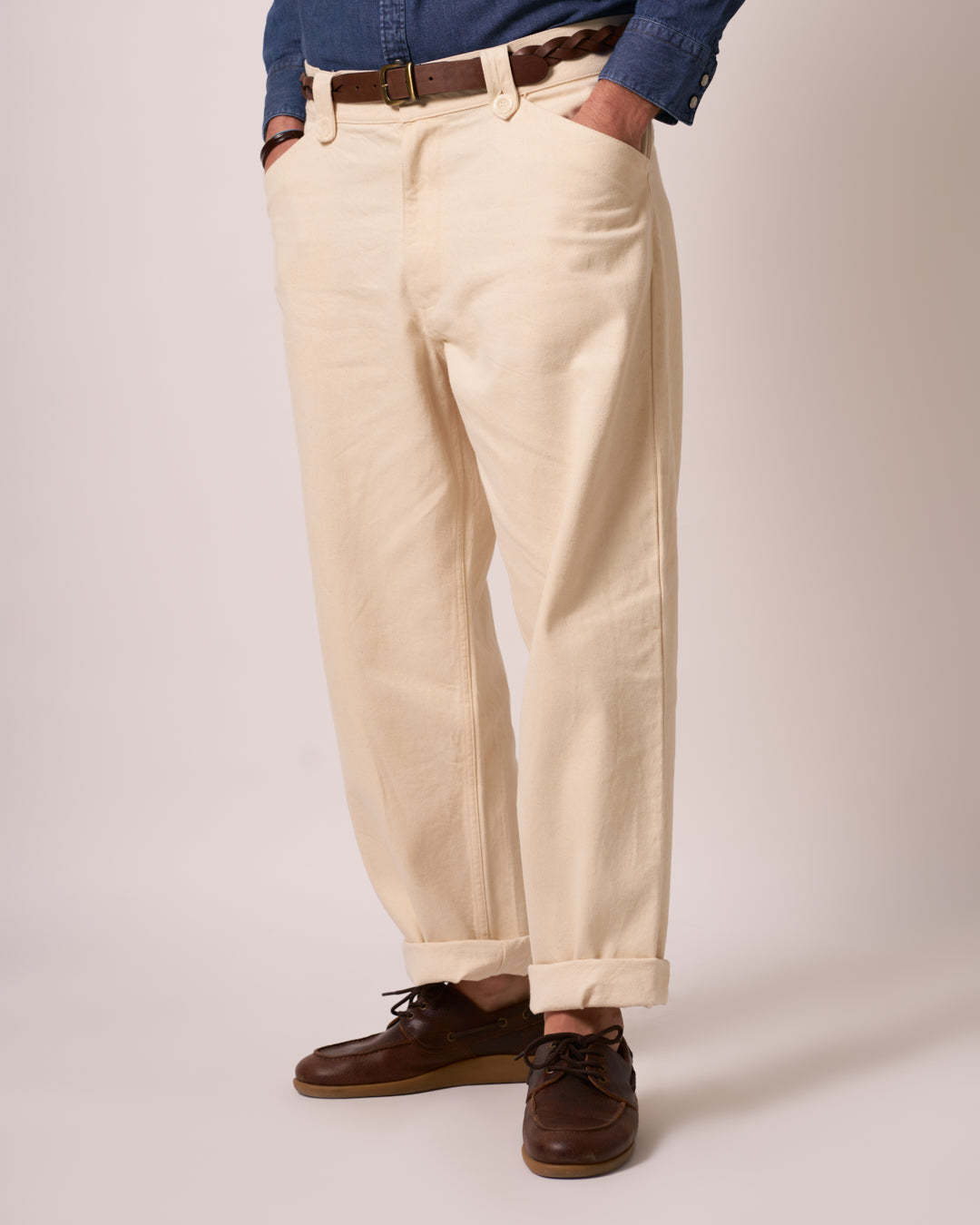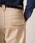 Pantalone di ispirazione Corsa, più ampio nella parte superiore rispetto al fondo, tasche anteriori a taglio orizzontale e unica tasca posteriore. Chiusura con mono bottone e zip. Anche qui troviamo gli iconici passanti Maremosso.