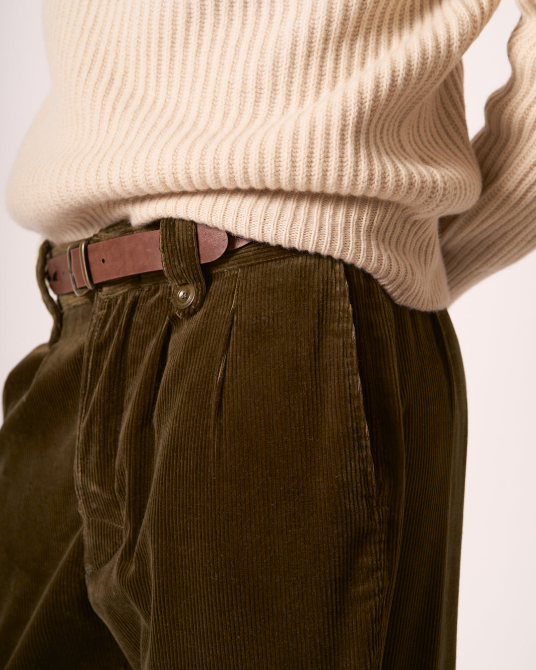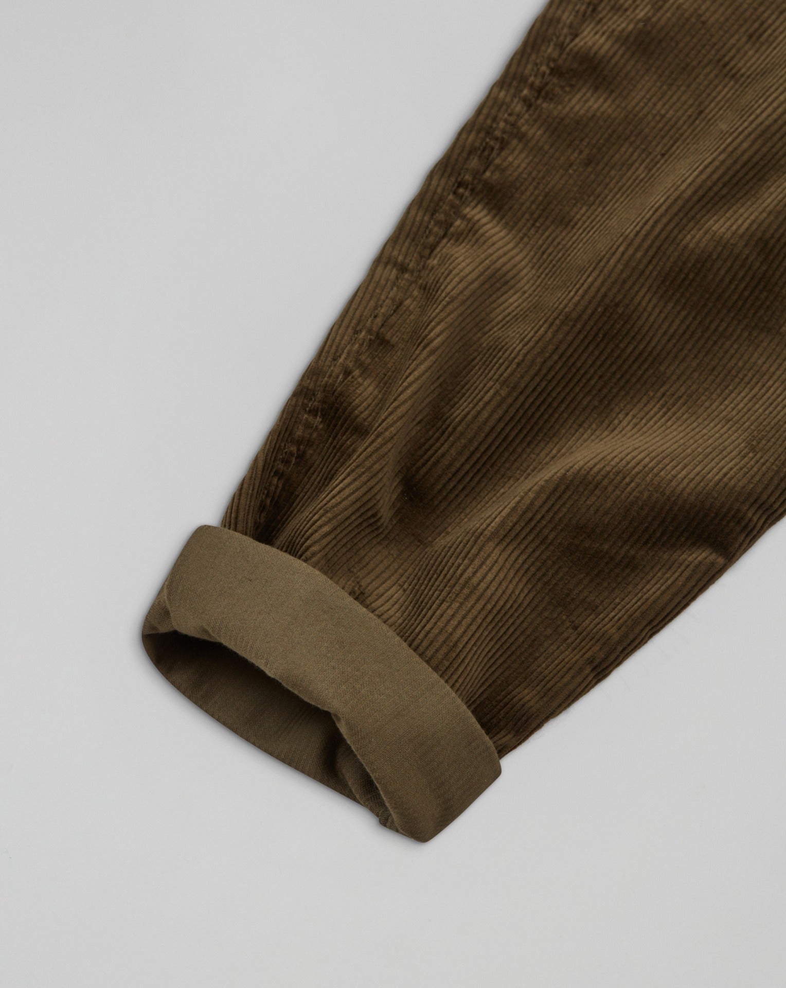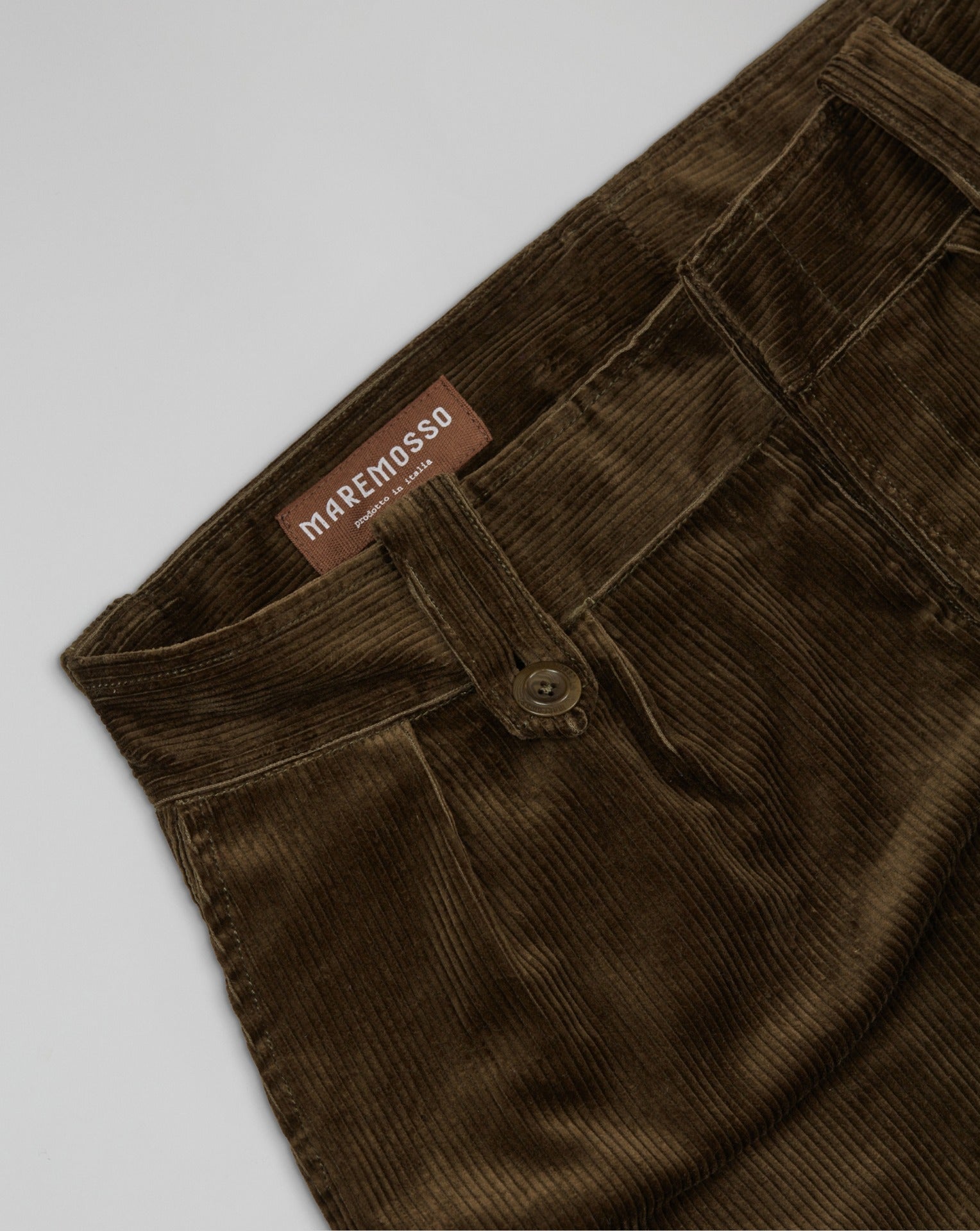 Pantalone in velluto di altissima qualità, rifinito con doppia pinces e chiusura con bottone in corozo a scomparsa. Vestibilità normale, due tasche laterali, i pantaloni in velluto Maremosso possono essere indossati con o senza risvolto.