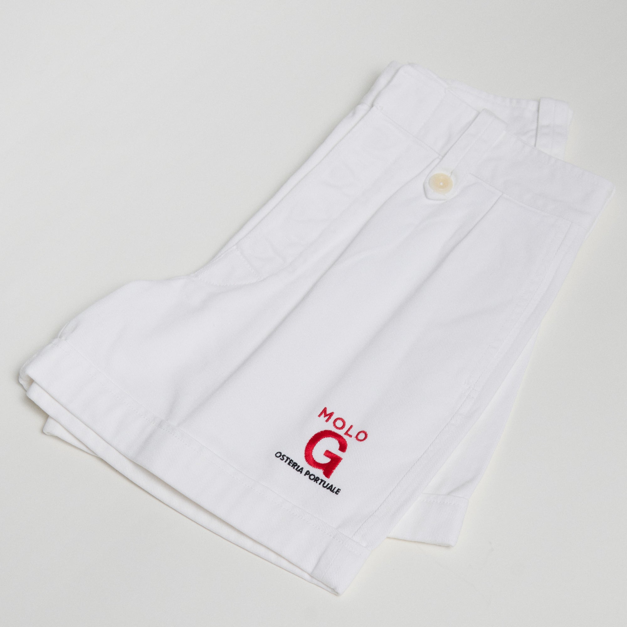 Per Molo G, osteria portuale nel cantiere ESAOM di Portoferraio, abbiamo realizzato una fornitura personalizzata del nostro iconico bermuda per lo staff e in vendita presso l'osteria.