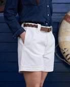 Bermuda a vita alta con pence in 100% cotone Manteco, tessuto d'eccellenza che ne garantisce freschezza e struttura impeccabile. Il modello è rifinito con cuciture ton sur ton e chiusura con bottoni in corozo a scomparsa. Due tasche laterali, passanti in vita con bottoni e risvolto finale, caratteristica distintiva di tutti i bermuda Maremosso.